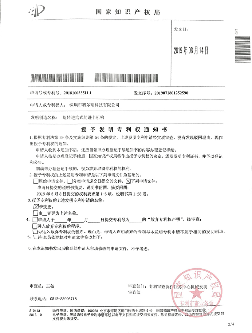 Congratulations to our company on the invention patent of "rotating feed type input card structure" being authorized by the state intellectual property office, and the invention patent notice granted on August 14, 2019.