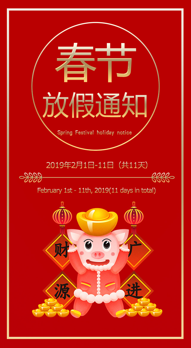 In order to let everyone have a happy and peaceful Spring Festival, according to the 2019 Spring Festival holiday arrangement announced by the state, combined with the company's actual situation and work arrangements, the company's Spring Festival holiday schedule is as follows: February 1, 2019 (Lunar July 27) ~February 11th, 2019 (the seventh day of the first lunar month) (11 days in total), and officially go to work on February 12 (the eighth day of the first lunar month).